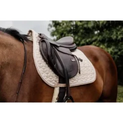 Onze zadeldoek Corduroy is gemaakt voor dressuuren biedt een zeer aangename scheiding tussen de rug van het paard en het zadel en beschermt het paard tegen mogelijke wrijving. Deze zadeldoek heeft een zeer stijlvolle look door het mooie ribfluweel materiaal in combinatie met gedraaide bies en diamanten stiksel. De zadeldoek heeft geen vervelende bandjes om aan het zadel vast te maken, enkel een lus voor de singel. Het Kentucky logo is subtiel aangebracht in de vorm van een lederen ruitje dat nog voldoende ruimte biedt om een eigen logo te borduren. De zadeldoek is machine wasbaar op 30°, geen droger.-Aangename scheiding tussen rug en zadel-Enkel riem voor singel-Subtiel artificieel lederen logo-Ruimte om de borduren