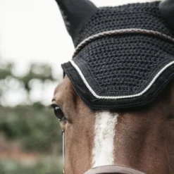 Dit Fly Veil Leatheris een combinatie van de moderne Amerikaanse look en Kentucky Horsewear’s product expertise. Het Kentucky Horsewear oornetje Fly Veil Leatheris met de hand gemaakt en afgewerkt met een bruin artificieel lederen randje om het een extra klassevolle uitstraling te geven.Dit oornetje beschermt de oren van het paard tegen vliegen en geluid tijdens het rijden. Het materiaal rond de oren rekbaar en sluit mooi aan voor een perfecte pasvorm. Het nekstukje is langer waardoor het oornetje blijft zitten en niet wegglijdt. Er werd geen zichtbaar logo op geborduurd waardoor de ruiter of sponsor zijn eigen logo kan plaatsen. Alleen met de hand wassen.