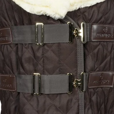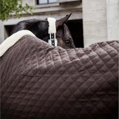 Het Showdeken is gemaakt van 600D high tenacity polyester met een stijlvolle en tijdloze diamantvormige quilting. Hierdoor is het erg moeilijk het deken te scheuren en blijft er geen schaafsel aan het deken kleven. Om druk op de schouders en de schoft te verlichten, is de kraag van het showdeken gemaakt van onze populaire artificiële schapenvacht. Naast een chique uitstraling is de artificiële wol ook veel comfortabeler. Wanneer je paard bijvoorbeeld aan het eten is, zal het deken niet in de borst snijden. Het Showdeken heeft een vulling van 160 gram fiber fil, wat dezelfde eigenschappen heeft als dons maar geen geuren absorbeert. Om schuurplekken te voorkomen, is het deken gevoerd met onze kenmerkende artificiële konijnenvacht. Deze stof is extreem zacht en zorgt voor een glanzend effect op de vacht van het paard. Bovendien creëert de artificiële konijnenvacht kleine luchtzakjes. Deze zakjes vangen de lichaamswarmte van het paard op en houden deze vast, waardoor een extra isolerende laag ontstaat. De combinatie van de materialen zorgt voor een zeer ademend deken met een hoge warmte-gewicht verhouding.