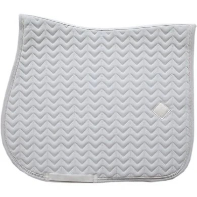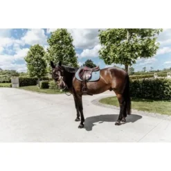 Onze veelzijdigheid zadeldoek Fishbone heeft de ideale vorm voor jumping, zorgt voor een schokabsorberend effect tussen de rug van het paard en het zadel en voorkomt wrijving. Dit dekje heeft het unieke visgraat motiefen is gemaakt uit zeer ademend materiaal (43% nylon, 43% polyester en 14% spandex). Dankzij de goede pasvorm is er geen nood aan lus vooraan om het dekje aan het zadel vast te maken, wel een nylon riem voor de singel. De fishbone zadeldoek heeft een subtiel lederen logo in dezelfde kleur als het dekje maar tegelijk ook nog voldoende ruimte om te borduren.Wasbaar op30°, geen droger.
