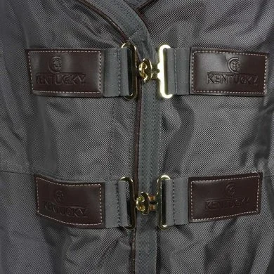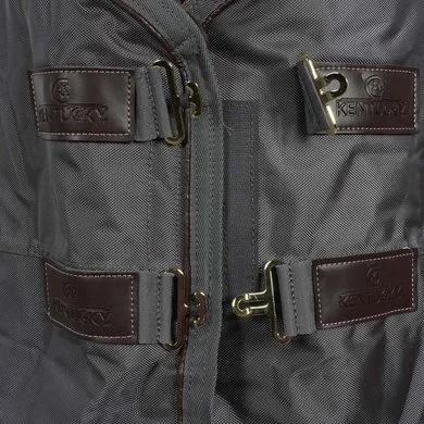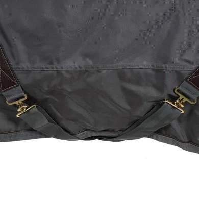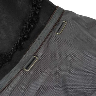Ditwinterdeken Turnout Rug All Weather is 160g gevuld en is heel sterk. De buitenstof is gemaakt van 1680 Denier High Tenacity Polyester waardoor het deken extreem sterk en duurzaam is. Dankzij de waterdichte en ademende PU coating is het deken ademend, vuilafstotend en toch bestand tegen alleweersomstandigheden. Ter hoogte van de borst, schouders en nek zijn de naden en kanten van het deken langs de binnenzijde gevoerd met artificieel konijnenvacht voor extra comfort en om schuurplekken te voorkomen. Het deken heeft twee klassieke borstsluitingen gecombineerd met een sterke klittenbandsluiting, twee kruissingels en een elastische, afneembare bilsluiting met plastic huls (makkelijk schoon te maken). De staartflapbiedt extra bescherming en warmte. Het nekgedeelte (0g) is apart aan te kopen en dus ook afneembaar. Het wordt vastgemaakt aan het deken met behulp van vier sterke klittenbandsluitingen en dichtgemaakt met twee sterke klittenbandsluitingen. De afwerking met de bruine artificieel lederen bies en de mooie artificieel lederen afwerking van de sluitingen zorgen voor een zeer stijlvolle look. Het deken is machine wasbaar op 30°, geen droger.