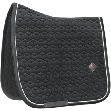Dit zadeldoek Saddle Pad Velvet met dubbel gedraaide bies is zeer stijlvol en elegant. Biedt een schok dempende functie aan tussen de rug van het paard en het zadel en voorkomt eventuele wrijving. Het logo is centraal geplaats zodat er nog mogelijkerwijs plaats is voor borduurwerk. Er zijn bovenaan geen vervelende bandjes aanwezig om het zadel vast te maken, enkel bandjes voor de singel. Wasbaar op 30°, geen droger.