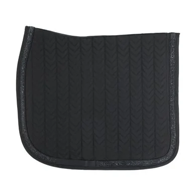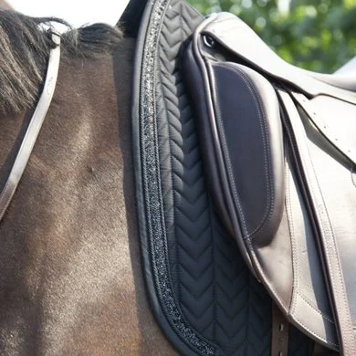 Onze Glitter Stone zadeldoek is gevormd voor dressuur of jumping en zorgt voor een uitstekende schokabsorbering en bescherming tegen wrijving tussen de rug van uw paard en het zadel. De zadeldoek heeft een uniek sterrenpatroon en is versierd met een prachtige afwerking in Glitter koord. Het heeft geen vervelende riemen om aan het zadel te bevestigen, enkel een nylon riempje voor de singel. Het deken is machinewasbaar op 30°, geen droogkast.